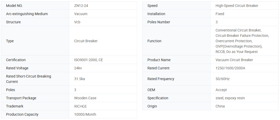 ZN12-24 진공 회로 차단기는 정격 전압이 24kV 및 3 상 AC 50Hz의 실내 고전압 스위치 기어입니다. 작동 메커니즘은 AC 또는 DC 또는 수동으로 작동 할 수있는 스프링 에너지 저장 유형입니다.이 회로 차단기는 클래스 II 오염 된 영역에서 환경 사용 요구 사항을 충족시키는 강화 된 절연 유형입니다.이 회로 차단기는 간단한 구조, 강력한 수명, 완전한 운영 기능, 단순한 운영 위험, 특히 전력 공장 및 구체적으로 적합한 전력 공장 및 구체적 전환기, 특히 전원 공장 및 구체적으로 전환기를 갖추고 있습니다. 이 제품은 GB1984-89“AC 고전압 회로 차단기”표준을 준수합니다.