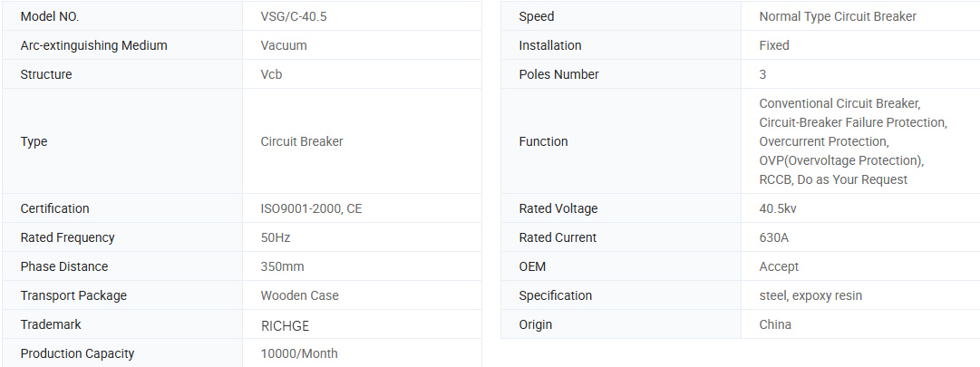 VSG-C/40.5 타입 측면 설치 실내 고전압 진공 회로 차단기 스프링을 저장 에너지에 사용했습니다. 작동 메커니즘은 수동 및 전자 유전체 작동에 의해 두 가지 방식으로 작동 할 수 있으며, 특성은 GB1984-2003 고전압 AC 회로 차단기, JB3855-1996 3.6-4.5KV 실내 AC 고전압 AC 회로 차단기 및 IEC 표준 62271-100 : 2001622271-100 : 2001 고 전복 AC Circit BreakER에 따른 것입니다.
