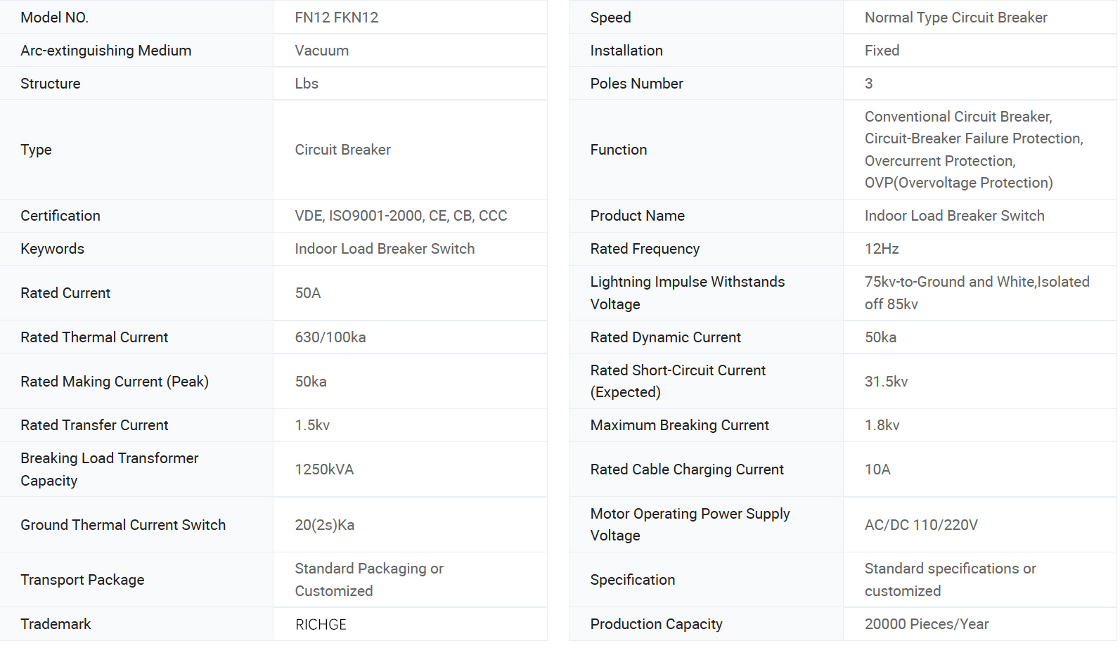 FKN12-12D/630-20 실내 AC 고전압 부하 스위치는 정격 전압이 12KV이고 정격 주파수가 50HZ인 3상 고전압 개폐기입니다. 이는 부하 전류, 폐쇄 루프 전류, 무부하 변압기 및 케이블 충전 전류, 결합된 단락 전류를 전환하는 데 사용됩니다. 접지 스위치가 장착된 부하 스위치는 단락 전류를 견딜 수 있으며 제어 및 보호를 위해 3상 폐쇄 루프 회로 또는 하단 전원 공급 시스템이 있는 배전 변전소 및 산업 전기 장비에 주로 사용됩니다.