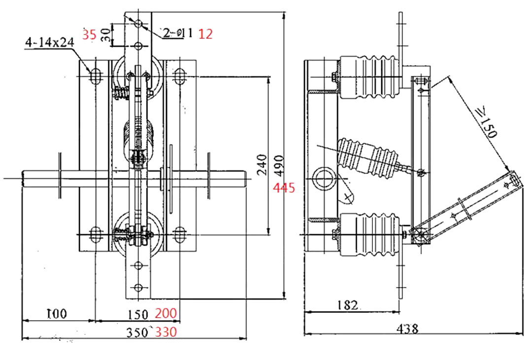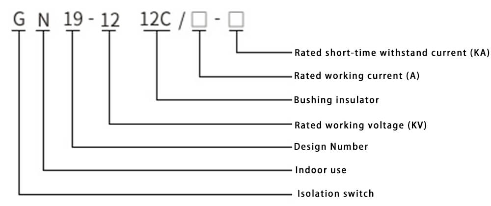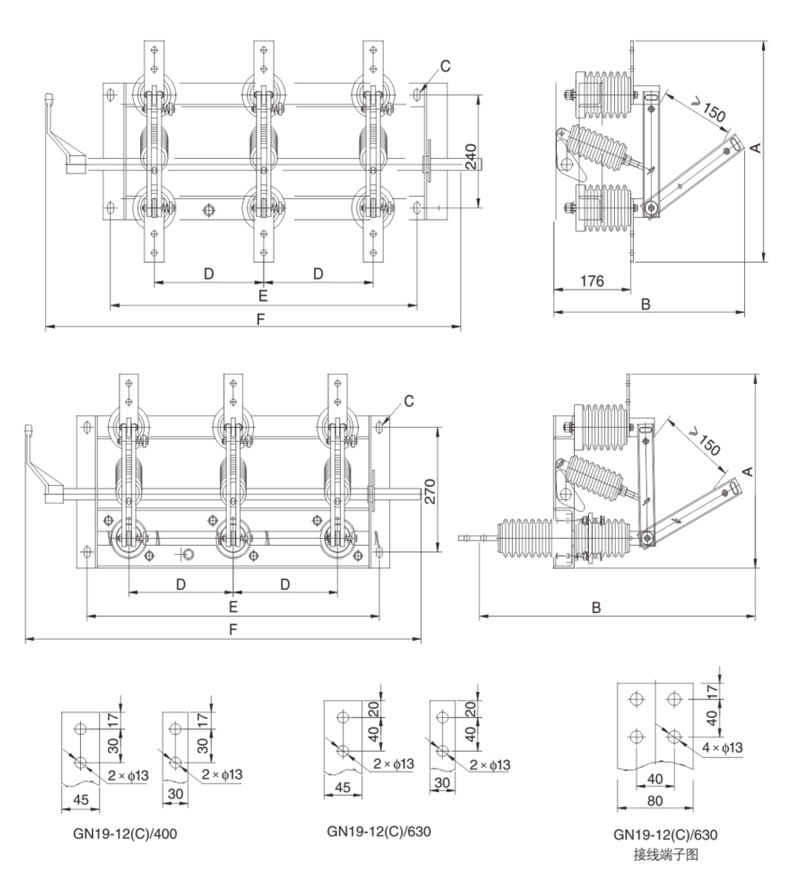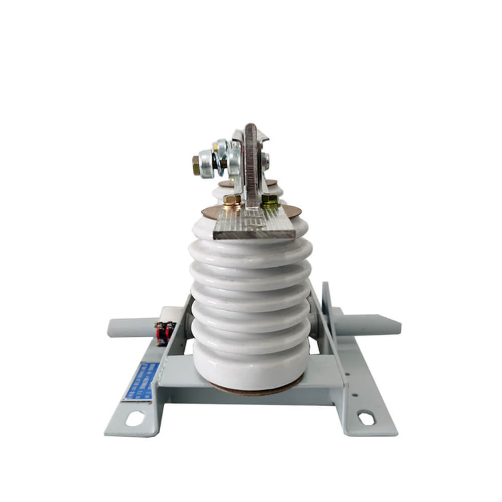 The conductive part of GN19-12/400, 630, 1000, 1250 type disconnect switch is fixed on the base by two pillar insulators for each phase. (GN19-12C/400, 630, 1000, 1250 type has one pillar insulator and one porcelain casing insulator.) The three phases are installed in parallel, and the conductive part consists of static contacts of contact knives and contact holders (or conductive rods). Each phase of the contact knife are connected to the middle of the tie insulator, tie insulator and installed on the base of the spindle connected. The spindle is connected to the connecting rod (user-provided) and CS6-1 type of moving mechanism through the handle. The connecting contact knife is composed of two slotted copper plates, which not only increases the heat dissipation area of the contact knife to lower the bottom temperature, but also improves the mechanical strength of the contact knife, so that the dynamic stability of the switch is improved. One end of the contact knife is mounted on the contact block (or on the conductive rod) by a bolt (car of Shaw). GN19-12/1000, 1250 in contact with the installation of magnetic locking plate, plus the purpose of the magnetic locking plate is that when a large short-circuit current to enhance the two groove contact knife between the| attraction. GN19-12/400, 630 disconnect switches have a small limit through current, so there is no need to add a magnetic locking plate.