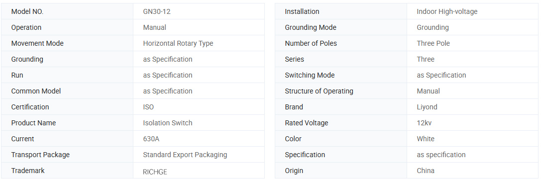 GN30-12 실내 회전식 고전압 단로기는 회전식 칼을 갖춘 새로운 유형입니다. 주요 구조식은 3상 공통 로우 프레임의 상부 및 하부 평면에 두 세트의 절연체와 접점을 고정하여 나이프를 회전시켜 스위치를 열고 닫는 것입니다. GN3-12D 스위치는 다양한 전원 시스템의 요구 사항을 충족하기 위해 GN30-12를 기반으로 한 형태의 연결 나이프를 추가합니다. 이 제품은 디자인이 컴팩트하고 공간이 작으며 절연성이 강하고 설치 및 조정이 용이합니다. "AC 고전압 절연 스위치 및 접지 스위치"의 요구 사항을 충족하며 정격 전압이 최대 10KV AC 50Hz 이하인 실내 시스템에 적용 가능합니다. 전압이 있고 부하가 없을 때 개폐 회로로 사용할 수 있습니다. 고전압 개폐 장치와 함께 사용하거나 단독으로 사용할 수 있습니다.
