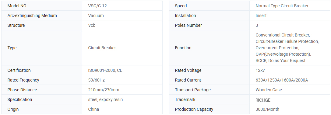 VSG-C/12 타입 측면 설치 실내 고전압 진공 회로 차단기 스프링을 저장 에너지에 사용했습니다. 작동 메커니즘은 수동 및 전자 유전체 작동에 의해 두 가지 방식으로 작동 할 수 있으며, 특성은 GB1984-2003 고전압 AC 회로 차단기에 따른다.